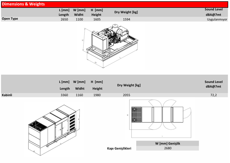 Pour assurer l’isolation acoustique (ISO8528-10:1998) et protéger le générateur des effets corrosifs des conditions méteorologiques extérieures, des cabines ou des conteneurs sout utilises en fonction de la taille du générateur ou du degré d’intensité sonore. Bien que la priorité lors de la conception des cabines ne vise que le niveau sonore, en plus des conditions déterminées par les normes ISO3046 et ISO8528, le générateur est conçu pour fourir la puissance déclarée dans un climat tropical, à une température ambiante de 50°C, avec une bumidité relative de 30% et au nivenu de la mer. Les cabines présentent des caractéristiques telles qu’use structure compacte, une faible hauteur, un fsble niveau sonore, un accès facile à l’alternateur du moteur et au pannes de commande, um levage en deux points, un silencieux déchappement caché à l’intérieur de la cabine pour des raisons de sécurité et de non-corrosion, et la possibilité d’être démontées.