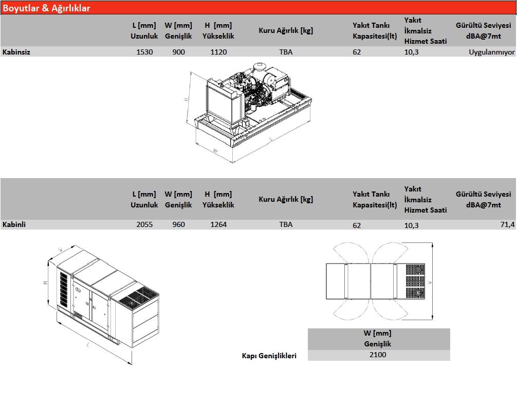 Ses izolasyonu sağlamak (ISO8528-10:1998) ve jeneratörü dış hava şartlarının korozif etkilerinden korumak için jeneratörlerimizin büyüklüğüne veya ses şiddetinin derecesine göre kabin veya konteyner kullanılır. Kabinler tasarlanırken önce kabinden ses seviyesi olarak hedeflenmiş, ve yine TS03046 ve ISO8528 standartlarında belirtilmiş olduğu koşullara ilave olarak Tropikal iklimde ve 50°C ortam sıcaklığında, 330 bağlı nem değerinde ve deniz seviyesinde jeneratör, beyan edilen güçte kesintisiz çalışma özelliği ile dizayn edilmiştir. Kabinler, kompakt yapı, düşük yükseklik, düşük ses seviyeleri, motor-alternatör ve kontrol panosuna kolay erişim, ışık noktaları takımları, güvenlik ve paslanma olmaması için kabin içerisine saklanmış egzoz susturucusu, demonte olabilme özelliği gibi özelliklere sahiptir.