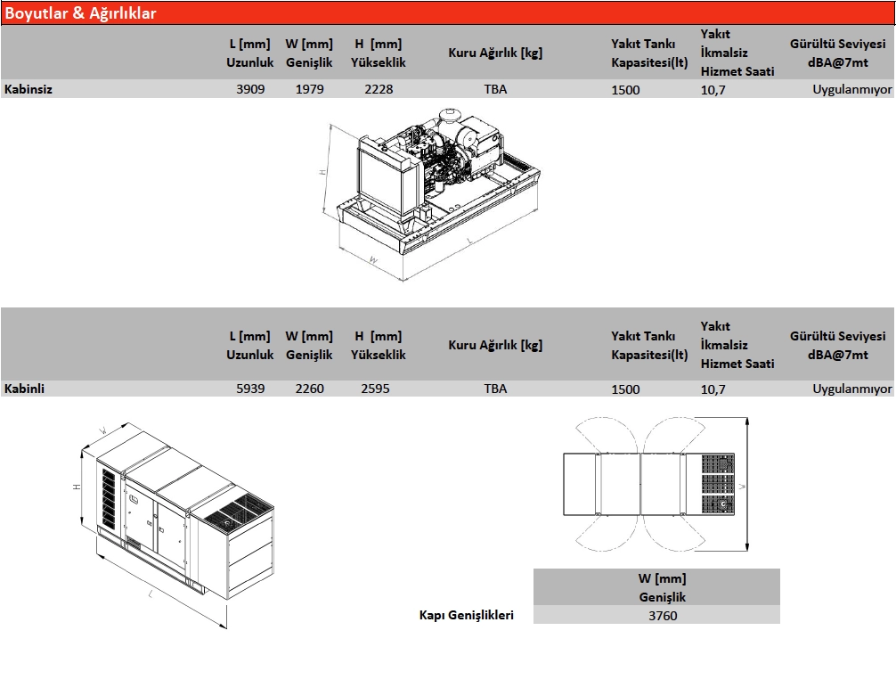 Ses izolasyonu sağlamak (ISO8528-10:1998) ve jeneratörü dış hava şartlarının korozif etkilerinden korumak için jeneratörlerimizin büyüklüğüne veya ses şiddetinin derecesine göre kabin veya konteyner kullanılır. Kabinler tasarlanırken önce kabinden ses seviyesi olarak hedeflenmiş, ve yine TS03046 ve ISO8528 standartlarında belirtilmiş olduğu koşullara ilave olarak Tropikal iklimde ve 50°C ortam sıcaklığında, 330 bağlı nem değerinde ve deniz seviyesinde jeneratör, beyan edilen güçte kesintisiz çalışma özelliği ile dizayn edilmiştir. Kabinler, kompakt yapı, düşük yükseklik, düşük ses seviyeleri, motor-alternatör ve kontrol panosuna kolay erişim, ışık noktaları takımları, güvenlik ve paslanma olmaması için kabin içerisine saklanmış egzoz susturucusu, demonte olabilme özelliği gibi özelliklere sahiptir.