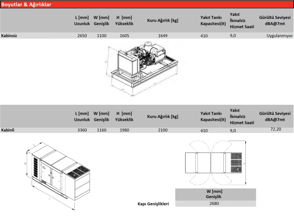 Ses izolasyonu sağlamak (ISO8528-10:1998) ve jeneratörü dış hava şartlarının korozif etkilerinden korumak için jeneratörün büyüklüğüne veya ses şiddetinin derecesine göre kabin veya konteyner kullanılır. Kabinler tasarlanırken öncelikli sadece ses seviyesi olarak hedeflenmiş, de yine ISO3046 ve ISO8528 standartlarında belirlenmiş olduğu koşullara ilave olarak Tropikal iklimde ve 50°C ortam sıcaklığında, %30 bağıl nem değerinde ve deniz seviyesinde jeneratör, beyan edilen gücü verecek şekilde dizayn edilmiştir. Kabinler, kompakt yapı, düşük yükseklik, düşük ses seviyesi, motor-alternatör ve kontrol panosuna kolay erişim, iki noktadan kaldırma, güvenlik ve paslanma olmaması için kabin içerisine saklanmış egzoz susturucusu, demonte olabilme özelliği gibi özelliklere sahiptir.