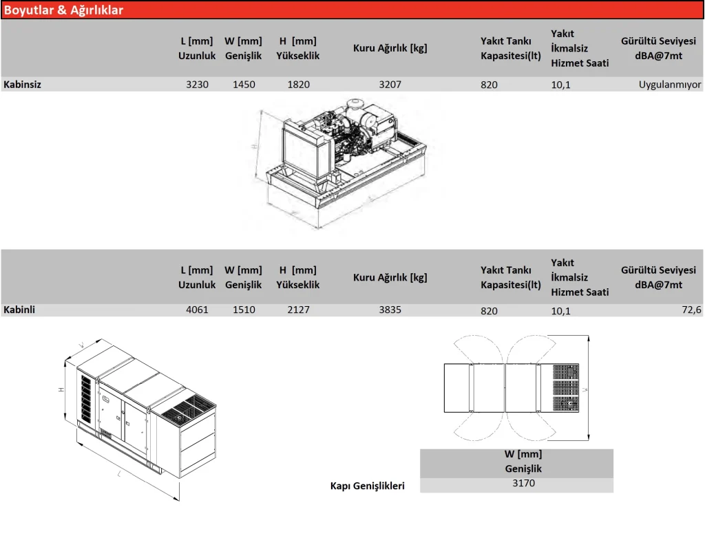 Ses izolasyonu sağlamak (ISO8528-10:1998) ve jeneratörü dış hava şartlarının korozif etkilerinden korumak için jeneratörün büyüklüğüne veya ses şiddetinin derecesine göre kabin veya konteyner kullanılır. Kabinler tasarlanırken öncelikli sadece ses seviyesi olarak hedeflenmiş, de yine ISO3046 ve ISO8528 standartlarında belirlenmiş olduğu koşullara ilave olarak Tropikal iklimde ve 50°C ortam sıcaklığında, %30 bağıl nem değerinde ve deniz seviyesinde jeneratör, beyan edilen gücü verecek şekilde dizayn edilmiştir. Kabinler, kompakt yapı, düşük yükseklik, düşük ses seviyesi, motor-alternatör ve kontrol panosuna kolay erişim, iki noktadan kaldırma, güvenlik ve paslanma olmaması için kabin içerisine saklanmış egzoz susturucusu, demonte olabilme özelliği gibi özelliklere sahiptir.