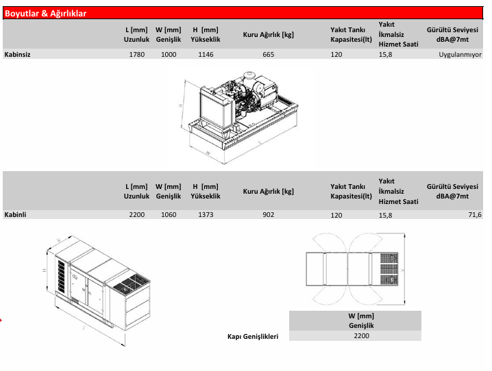Ses izolasyonu sağlamak (ISO8528-10:1998) ve jeneratörü dış hava şartlarının korozif etkilerinden korumak için jeneratörlerimizin büyüklüğüne veya ses şiddetinin derecesine göre kabin veya konteyner kullanılır. Kabinler tasarlanırken önce kabinden ses seviyesi olarak hedeflenmiş, ve yine TS03046 ve ISO8528 standartlarında belirtilmiş olduğu koşullara ilave olarak Tropikal iklimde ve 50°C ortam sıcaklığında, 330 bağlı nem değerinde ve deniz seviyesinde jeneratör, beyan edilen güçte kesintisiz çalışma özelliği ile dizayn edilmiştir. Kabinler, kompakt yapı, düşük yükseklik, düşük ses seviyeleri, motor-alternatör ve kontrol panosuna kolay erişim, ışık noktaları takımları, güvenlik ve paslanma olmaması için kabin içerisine saklanmış egzoz susturucusu, demonte olabilme özelliği gibi özelliklere sahiptir.
