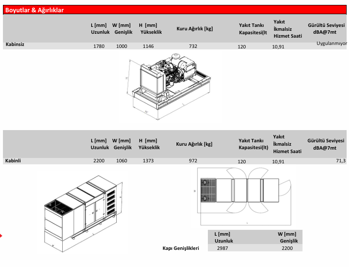 Ses izolasyonu sağlamak (ISO8528-10:1998) ve jeneratörü dış hava şartlarının korozif etkilerinden korumak için jeneratörlerimizin büyüklüğüne veya ses şiddetinin derecesine göre kabin veya konteyner kullanılır. Kabinler tasarlanırken önce kabinden ses seviyesi olarak hedeflenmiş, ve yine TS03046 ve ISO8528 standartlarında belirtilmiş olduğu koşullara ilave olarak Tropikal iklimde ve 50°C ortam sıcaklığında, 330 bağlı nem değerinde ve deniz seviyesinde jeneratör, beyan edilen güçte kesintisiz çalışma özelliği ile dizayn edilmiştir. Kabinler, kompakt yapı, düşük yükseklik, düşük ses seviyeleri, motor-alternatör ve kontrol panosuna kolay erişim, ışık noktaları takımları, güvenlik ve paslanma olmaması için kabin içerisine saklanmış egzoz susturucusu, demonte olabilme özelliği gibi özelliklere sahiptir.